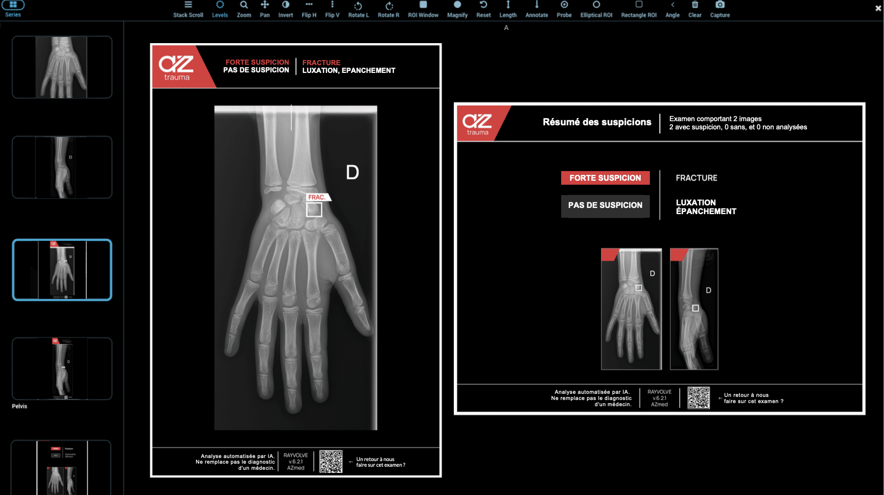- AZtrauma : détection automatique des lésions traumatiques osseuses (fracture, luxations, épanchements). Le logiciel fonctionne sur l’ensemble des membres périphériques (main, poignet, coude, avant-bras, bras, épaule, hanche, bassin, jambe, genou, cheville, pied) et sur le rachis.