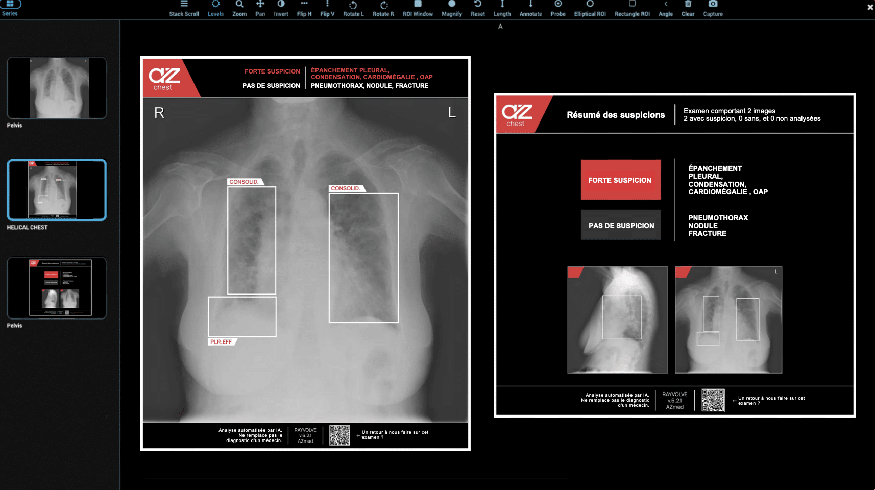 - AZchest : détection automatique des lésions thoraciques (condensation, épanchement pleural, pneumothorax, cardiomégalie, œdème aigu pulmonaire, fractures des côtes, nodules pulmonaires).